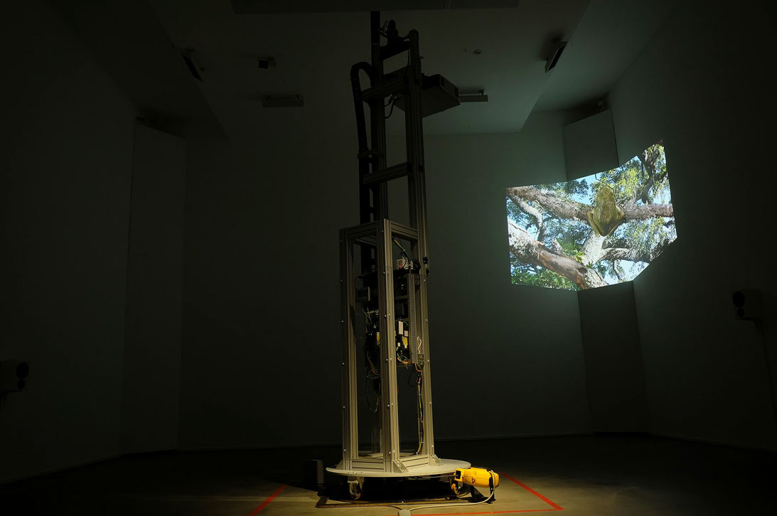 The videoinstallation is made up of a robotic sculpture which projects the film on all the surfaces of the exhibition space through a built-in video projector. The film moves in the room, 360° and on three axes, sliding on the four walls, as well as on the floor and the ceiling. In this way, the movement of the images returns, setting it in the entire exhibition space, the long plan-sequence that constitutes the film, faithfully reproducing the movements that the camera has made, through drones and steadycam. In doing so, the portrait of the tree and the history of the territory become a real inner skin of the space. Through the robotic sculpture, the duration of the cycle of movements of the projector coincides with that of the film, or approximately 22 minutes. The sound, spatialized through 8 sound sources arranged in the room, allows the visitor to immerse himself in the sound vortex, as well as in the visual one created by the video installation.